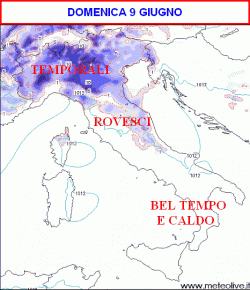 DOMENICA tempo instabile al nord, Toscana, Umbria e Marche con piogge e temporali, soleggiato e caldo altrove. LUNEDI moderatamente instabile al centro-nord con possibili temporali, migliore la situazione al sud e sulle Isole. MARTEDI temporali sulle Alpi e nelle zone interne nel pomeriggio, piu sole altrove. Temperature in aumento.