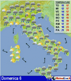 Domenica e lunedì generali condizioni di instabilità sulla Penisola, con piogge soprattutto al centro-sud ed in misura minore al nord. Clima fresco e ventoso ovunque. Martedì migliora al nord, ancora qualche rovescio o temporale al centro-sud. Lieve aumento delle temperature massime.