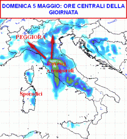 Domenica peggiora al centro e poi anche al nord, specie sul nord-est, con piogge e temporali sparsi. Fenomeni meno frequenti sulle Isole e all'estremo sud. Lunedì e martedì ancora moderata instabilità al centro-nord e nelle zone interne del meridione, tempo migliore altrove. Temperature ovunque gradevoli.