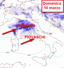 Domenica schiarite al nord-ovest e parte delle regioni meridionali. Rovesci altrove. Lunedì e martedì tempo instabile su tutta l'Italia, con piogge sparse e rovesci, non farà eccessivamente freddo.