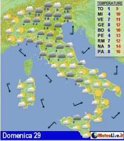 Domenica qualche pioggia in transito tra il nord-est e il centro, per il resto nubi sparse e tempo asciutto. Lunedì piogge sparse in Adriatico e al sud associate ad un moderato calo termico. Martedì ultimi fenomeni al sud, in attenuazione, abbastanza buono altrove.