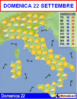 Bel tempo ovunque dalla mattina alla sera. Eventuali addensamenti avranno carattere temporaneo ed interesseranno essenzialmente le zone interne. Ventilazione debole settentrionale, temperature massime in aumento specie nelle pianure interne.