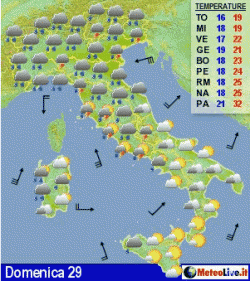 Domenica piogge e temporali al nord, in estensione alla Toscana, al Lazio e al nord della Sardegna in giornata, bello e caldo al sud. Lunedì tempo instabile su tutta l'Italia, con piogge più intense al centro-sud. Generale calo delle temperature. Martedì ultimi fenomeni in Adriatico e al sud, bel tempo altrove.