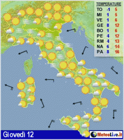 Giovedì e venerdì condizioni di stabilità su tutta l'Italia con nebbia ed inquinamento specie sulle pianure del nord, bel tempo e clima mite in montagna. Sabato parziale aumento della nuvolosità al centro-nord, senza precipitazioni.