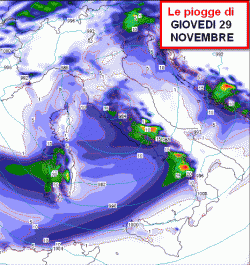 Ancora piogge intense al mattino sulla Sardegna occidentale e lungo il versante tirrenico. Fenomeni meno probabili sull’Umbria orientale e il versante adriatico. Nel corso della giornata lieve attenuazione dei fenomeni, ma precipitazioni sempre possibili. Più freddo.