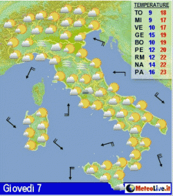 Giovedì bel tempo al centro-sud, nubi sparse al nord senza fenomeni. Venerdì qualche pioggia al nord e sulla Toscana, bel tempo e molto mite altrove. Sabato peggiora al nord e sul Tirreno con piogge, ancora asciutto e abbastanza soleggiato altrove.