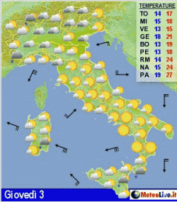 Rapido peggioramento su tutte le regioni ad iniziare dai settori occidentali. Possibilità di piogge anche intense e temporali specie tra la Bassa Toscana e il Lazio, in trasferimento verso levante. In serata migliora sulla Sardegna. Ventoso e temperature in calo.