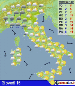 Al mattino qualche schiarita sulle Alpi, per il resto nuvolosità in nuovo generale aumento a partire da sud, con tendenza a precipitazioni dal pomeriggio ad iniziare dalla Liguria. Neve sopra i 700-800 metri sul Piemonte, 900-1000 sulle Prealpi Lombarde. Freddo.