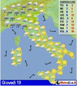 Nubi sparse su tutte le regioni, specie sulle regioni estreme e sulla Sicilia, ma con basso rischio di pioggia. Ampie schiarite sulla Campania e sul Molise. Ventilazione debole in genere da sud, un po’ freddo al mattino nelle valli, mite di giorno.