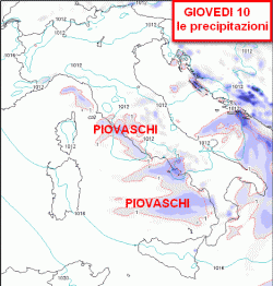Sulla Sardegna nubi sparse, con schiarite e tempo asciutto. Su tutte le altre regioni nubi in progressivo aumento, con piogge e rovesci specie sulla Toscana. Meno frequenti i fenomeni in Abruzzo. Quota neve sui 700-800 metri. Ventoso e freddo.