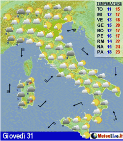 Giovedì ultime piogge al nord-ovest, rovesci sulla Sardegna, tempo asciutto ed in parte soleggiato altrove. Venerdì qualche rovescio possibile su Sardegna, Sicilia e medio-basso Tirreno, asciutto ed in parte soleggiato altrove. Sabato nuovo peggioramento al nord e sul Tirreno, bello altrove.