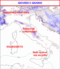 GIOVEDI nubi sulle zone estreme, senza pioggia. Ancora qualche temporale nel pomeriggio sui rilievi del centro-nord, per il resto bel tempo. VENERDI e SABATO bello su tutta la Penisola a parte qualche temporale sui rilievi nel pomeriggio. Progressivamente più caldo.