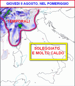 Giovedì temporali diffusi al nord-ovest, nubi in aumento al nord-est, sulla Toscana e sulla Sardegna, bello e caldo altrove. Venerdì qualche temporale al nord-est e al centro, migliora al nord-ovest. Sabato instabile su estremo nord-est, Adriatico e meridione, per il resto bel tempo. Temperature ovunque più sopportabili.
