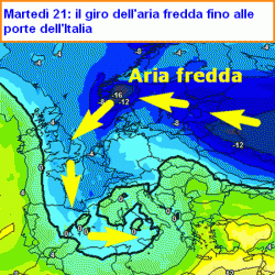E in effetti, come possiamo vedere dall’ultima mappa in basso, un po’ di freddo arriverà, a partire dal 21-22 gennaio. Notate che giro dovrà compiere il letto delle correnti fredde per raggiungere l’Italia; il percorso contempla il passaggio su Russia, Mitteleuropa, Francia, Mediterraneo occidentale e infine Italia. Un percorso infinito, che "diluirà" certamente il potenziale freddo inizialmente insito nella massa d’aria di partenza.