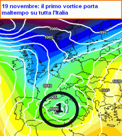 E non possiamo che aspettarci una botta di intenso maltempo per la giornata di martedì 19 che, come avevamo previsto in più occasioni, prevediamo essere la più difficile della settimana. I temporali che hanno sferzato la Sardegna si porteranno su Liguria, regioni tirreniche e settori ionici, dove replicheranno lasciando sul terreno notevoli quantitativi d’acqua. Neve sulle Alpi, ma a quote piuttosto elevate, in calo a fine giornata. Ecco nella seconda mappa il vortice responsabile di tutto il parapiglia atmsferico.