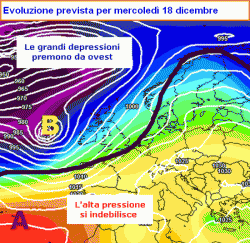 ANALISI della situazione attuale: l’alta pressione domina il bacino del Mediterraneo ma la sua struttura si sta lentamente indebolendo. Da ovest iniziano a premere flussi di aria umida, convogliati da un vasto e complesso sistema depressionario che nei prossimi giorni prenderà possesso del continente europeo. L’Italia verrà interessata almeno marginalmente da due perturbazioni, la prima tra il 19 e il 20 dicembre, la seconda tra il 23 e il 24 dicembre.