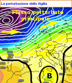 sull’Algeria? Eccolo rientrare in gioco proprio alla Vigilia di Natale, quando verrà richiamato verso i nostri mari da parte di una secnda perturbazione in discesa dall’Atlantico (quarta mappa). Si genererà così un nuovo corpo nuvolso che in questo caso, transiterà rapido e sbrigativo al centro-nord, per concentrarsi soprattutto al sud.