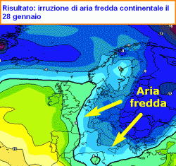 Dopo questa data, l’asse delle correnti ruoterà da settentrione e poi probabilmente a nord-est. La modifica varrà l’afflusso di aria fredda di origine continentale dalla Russia verso l’Italia. Il risultato concreto lo vediamo nell’ultima mappa in basso, dove è evidente il cuneo di aria fredda puntato verso di noi. Potrebbe essere una buona occasione per una fase propriamente invernale, almeno per qualche giorno a cavallo tra il 28 e il 31 gennaio.