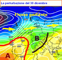 ANALISI della situazione attuale: i flussi portanti seguitano a scorrere ad elevato indice zonale (da ovest verso est), proponendo a ritmo regolare alcune ondulazioni di maggiore ampiezza entro le quali si inseriscono altrettante perturbazioni. Una di queste impegna in queste ore il nord-est e il centro ma con fenomeni modesti ed è attesa attardarsi tra il 30 dicembre e la giornata di San Silvestro al sud, parzialmente rinforzata.