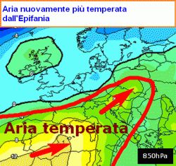L’Epifania vedrà un tempo in generale convalescenza, con passaggi nuvolosi alternati a schiarite. Precipitazioni sempre meno probabili e quadro termico che torna nuovamente ad addolcirsi (ultima figura in basso).