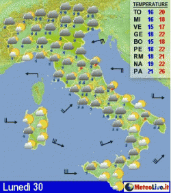 Lunedì tempo instabile su tutta l'Italia, con piogge più intense al centro-sud. Generale calo delle temperature. Martedì ultimi fenomeni in Adriatico e al sud, bel tempo altrove a parte addensamenti al nord. Mercoledì nubi al nord, bello al centro e al sud. Complessivamente gradevole.