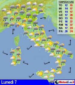 Lunedì generali condizioni di instabilità sulla Penisola, con piogge soprattutto al nord, nelle zone interne del centro e all'estremo sud. Clima fresco e ventoso ovunque. Martedì e mercoledì ancora condizioni moderatamente instabili, con piogge più probabili al centro-sud, occhiate di sole al nord.