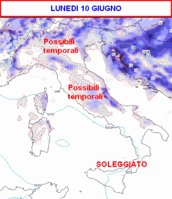 LUNEDI moderatamente instabile al centro-nord con possibili temporali, migliore la situazione al sud e sulle Isole. MARTEDI temporali sulle Alpi e nelle zone interne nel pomeriggio, piu sole altrove. MERCOLEDI fenomeni sempre piu limitati e sporadici nelle zone montuose, bello e caldo altrove.