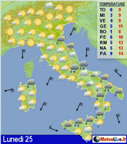 Lunedi progressivo calo delle temperature da est ad ovest con prime nevicate a bassa quota in Adriatico, bello altrove. Martedì e mercoledì freddo e ventoso sull'Italia, con gelate sulle pianure del nord e neve a quote molto basse lungo il versante adriatico.