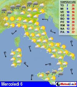 Nubi sparse al primo mattino, senza la minaccia di pioggia. Nel corso della giornata possibili precipitazioni sulle Alpi, sulla Lombardia e sulla Liguria centro-orientale. Qualche nevicata sulle Alpi al di sopra dei 1500-1600 metri. Asciutto altrove. Fresco e ventoso.