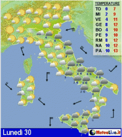 Nubi medio-alte al mattino, con il sole che potrebbe restare visibile. Bel tempo nel pomeriggio. Occasionali banchi di nebbia di notte e al mattino sulle pianure, in attenuazione durante il giorno. Freddo al mattino, meno freddo nell’arco della giornata.