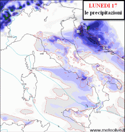 Lunedì precipitazioni in transito al centro e sul basso Tirreno, neve sui settori confinali delle Alpi. Martedì e mercoledì ancora qualche precipitazione in Adriatico e al meridione, nevosa a quote medie. Tempo asciutto ed in parte soleggiato altrove.
