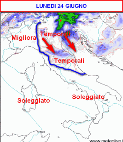 Lunedì passaggio temporalesco tra il nord-est e le regioni centrali, bello altrove. Martedì e mercoledi tempo un po' instabile al centro-sud e sul versante adriatico, con qualche temporale possibile; tempo migliore altrove. Ventoso e gradevole ovunque.