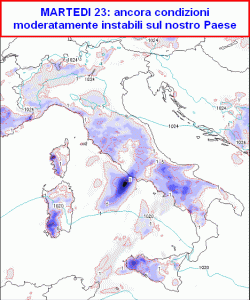 Al mattino tempo asciutto, con schiarite. Qualche rovescio sulla Sicilia e sulla Puglia. Nel pomeriggio instabilità in accentuazione nelle zone interne, con rischio di qualche pioggia o temporale, in attenuazione in serata. Clima nel complesso mite.