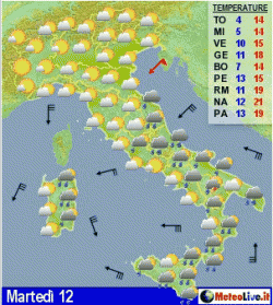 Martedì e mercoledì ancora piogge localmente intense in Adriatico e al sud, asciutto al nord e sul Tirreno. Clima ventoso e fresco. Giovedì ultime piogge su Abruzzo e meridione, spiccata variabilità con schiarite altrove. Vento in attenuazione e temperature in aumento.
