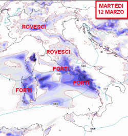 Tempo perturbato su tutte le regioni, ma in modo particolare sulla Sardegna, tra la bassa Toscana e il Lazio, dove saranno possibili temporali anche intensi. Possibili pause asciutte lungo il versante adriatico. Persistenza di venti umidi da sud-ovest, mite.