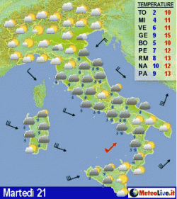 Un nuovo peggioramento interverrà su tutte le regioni. Piogge sparse, più intense sulla Liguria, dove potranno assumere anche carattere di rovescio. Nevicate sopra i 300-400 metri. Ventilazione moderata, temperature in calo nei valori massimi.
