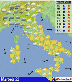 Martedì ancora nubi sparse al nord con piovaschi ad ovest, più sole altrove. Mercoledì piogge sparse al nord ed in parte sulla Toscana, nubi al centro, bel tempo al sud. Giovedì qualche rovescio al mattino al nord-est e al centro, asciutto ed in parte soleggiato altrove.