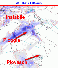 Tempo moderatamente instabile su tutte le regioni. Qualche schiarita sarà probabile al mattino, subito seguita da annuvolamenti intensi con rischio di temporali. I fenomeni dalla fascia prealpina sconfineranno sulle pianure prima di sera. Clima mite.