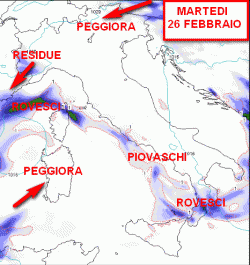 Martedì ancora qualche precipitazione su Sardegna e nord-ovest, migliora altrove, meno freddo. Mercoledì fenomeni al nord-est, Sardegna e basso Tirreno, asciutto altrove. Giovedì ultime precipitazioni su estremo nord-ovest, Sardegna e basso Tirreno, asciutto altrove. Progressivamente meno freddo.