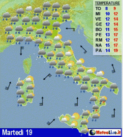 Nubi irregolari su tutte le regioni. Possibilità di rovesci ancjhe temporaleschi più probabili sulla Sardegna occidentale, lungo il Tirreno e nelle zone interne della Penisola. Ventilazione moderata occidentale, lieve calo delle temperature massime.