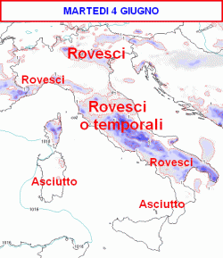 Schiarite sulla Sicilia e le zone estreme. Su tutte le altre regioni condizioni di moderata instabilità nel pomeriggio, con rovesci e qualche temporale più frequente nelle zone interne, ma sconfinante localmente anche sulle coste. Ventilazione moderata, mite.