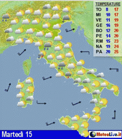 Martedì e mercoledì piogge sparse prima al centro e poi al sud accompagnate da venti forti, ma temperature nel complesso miti. Asciutto al nord. Giovedì bel tempo ovunque a parte banchi di nebbia al nord e qualche nube all'estremo sud, in attenuazione.