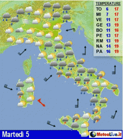 Temporali al mattino sul Lazio, in trasferimento verso sud; schiarite già presenti sull’alta Toscana e la Sardegna, piogge sparse altrove. Da metà giornata progressivo miglioramento da ovest verso est sulla Penisola, nuove deboli piogge in Sardegna. Mite e ventoso.