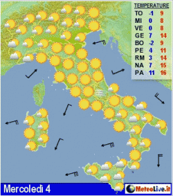 Mercoledì e giovedì bel tempo ovunque a parte residue piogge all'estremo sud mercoledì, in via di attenuazione. Banchi di nebbia in pianura specie di notte e al primo mattino. Venerdì nubi in aumento su Alpi e Tirreno, ma con scarsi fenomeni, per il resto bel tempo e abbastanza mite.