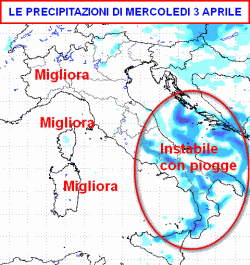 Mercoledì instabile al sud e in misura minore sulle regioni adriatiche, abbastanza buono il tempo altrove. Giovedì nuovo peggioramento al nord e su parte del centro, con piogge, bel tempo al sud. Venerdì instabile su gran parte del centro-nord, più sole sulle isole e all'estremo sud.