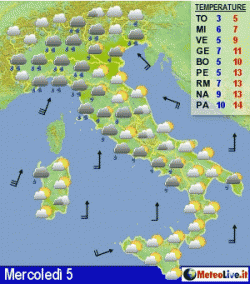 Lungo il versante adriatico pause asciutte e in parte anche soleggiate. Lungo il Tirreno qualche pioggia al mattino, seguita da una pausa e nuovo peggioramento in serata ad iniziare dalla Toscana e il nord della Sardegna. Ventilazione moderata da sud, non farà freddo.