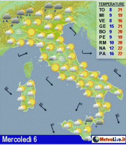 Mercoledì qualche precipitazione sulle Alpi e sulle regioni estreme, bello e mite altrove. Giovedì bel tempo al centro-sud, nubi sparse al nord senza fenomeni. Venerdì qualche pioggia al nord e sulla Toscana, bel tempo e molto mite altrove.