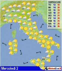 Mercoledì nubi sparse al nord-ovest, nelle zone interne del centro e in Calabria, bello altrove. Giovedì e venerdì generale variabilità, con qualche pioggia in serata sull'estremo nord-ovest. Temperature frizzanti al mattino, gradevoli di giorno.