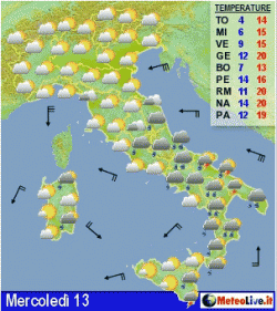 Mercoledì ancora piogge localmente intense in Adriatico e al sud, asciutto al nord e sul Tirreno. Clima ventoso e fresco. Giovedì ultime piogge su Abruzzo e meridione, spiccata variabilità con schiarite altrove. Vento in attenuazione e temperature in aumento. Venerdì nuovo peggioramento sull'Italia con neve a quote relativamente basse al nord-ovest