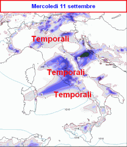 Tempo instabile su tutte le regioni, in modo particolare nel pomeriggio e nelle zone interne, dove saranno possibili rovesci e qualche temporale in sconfinamento parziale verso le coste. Tempo nettamente migliore sulla Sardegna. Ventilazione sostenuta occidentale, mite.